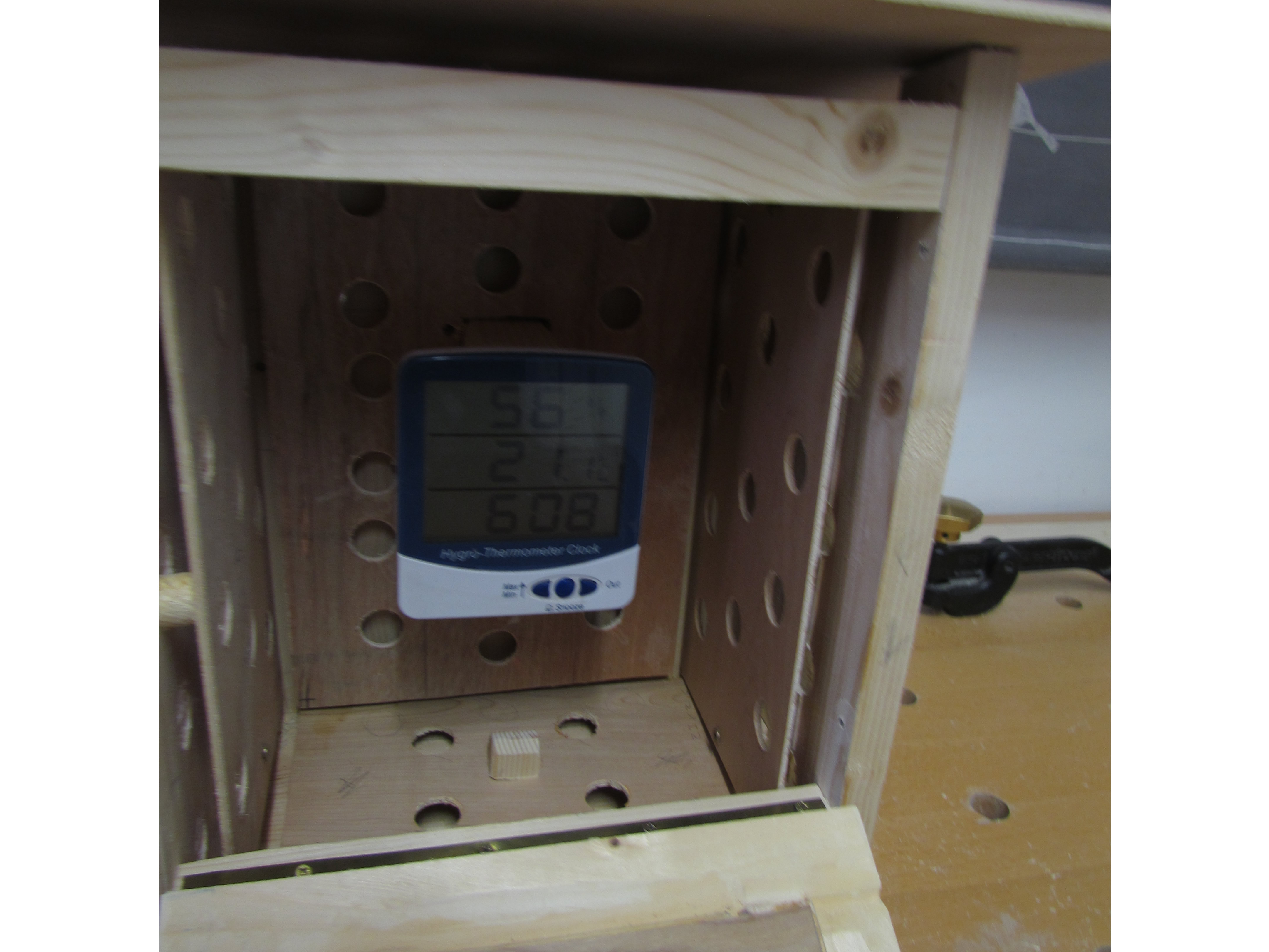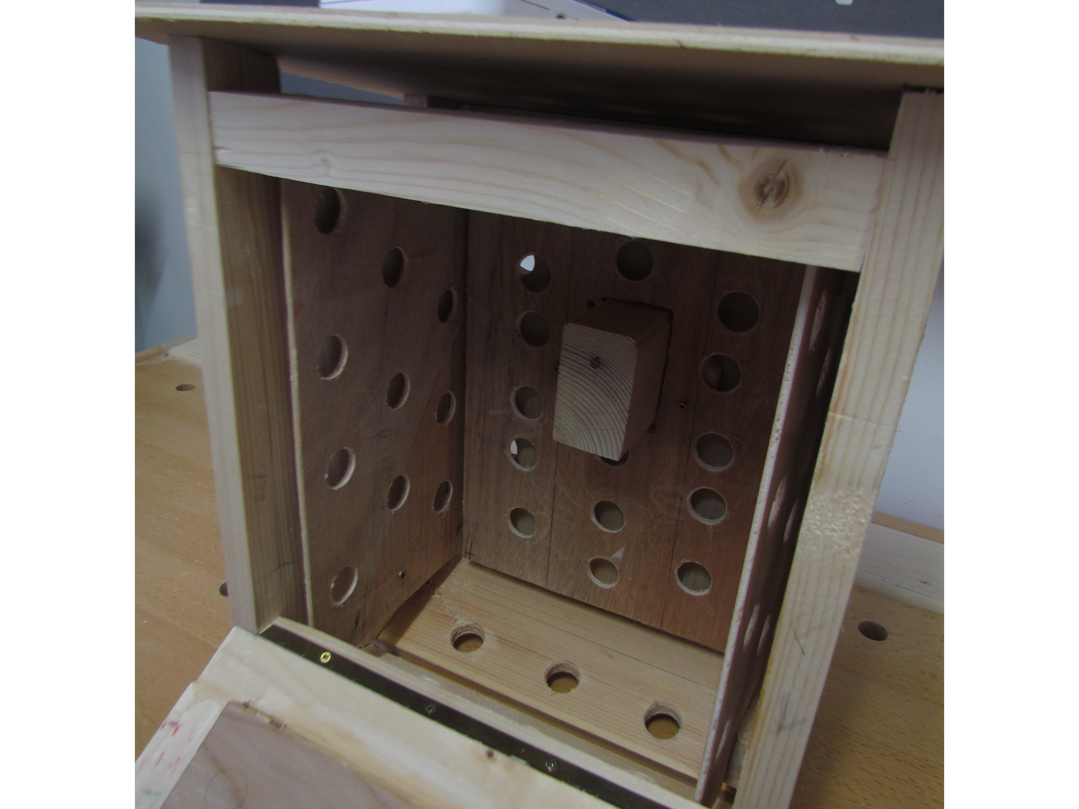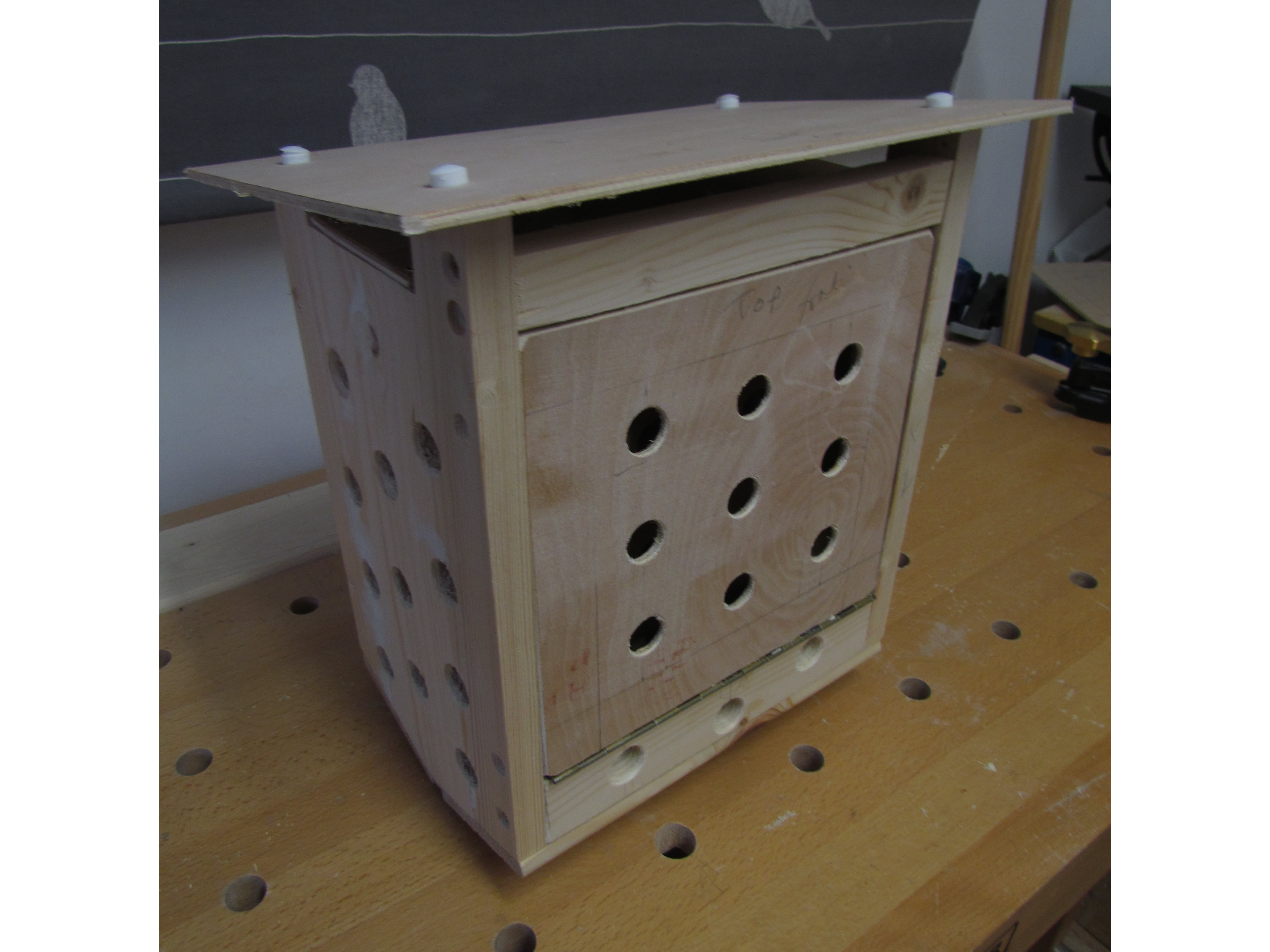 Weather box - with vents horizontal ventsThis weather box is an improvement on the weather box below. It has vents all round but the vents have been altered so that they can all be horizontal. this is better for stopping rain and wind from getting into the box. It provides just the right amount of ventilation. The construction is very similar to the one below. You can see the box open here. |
