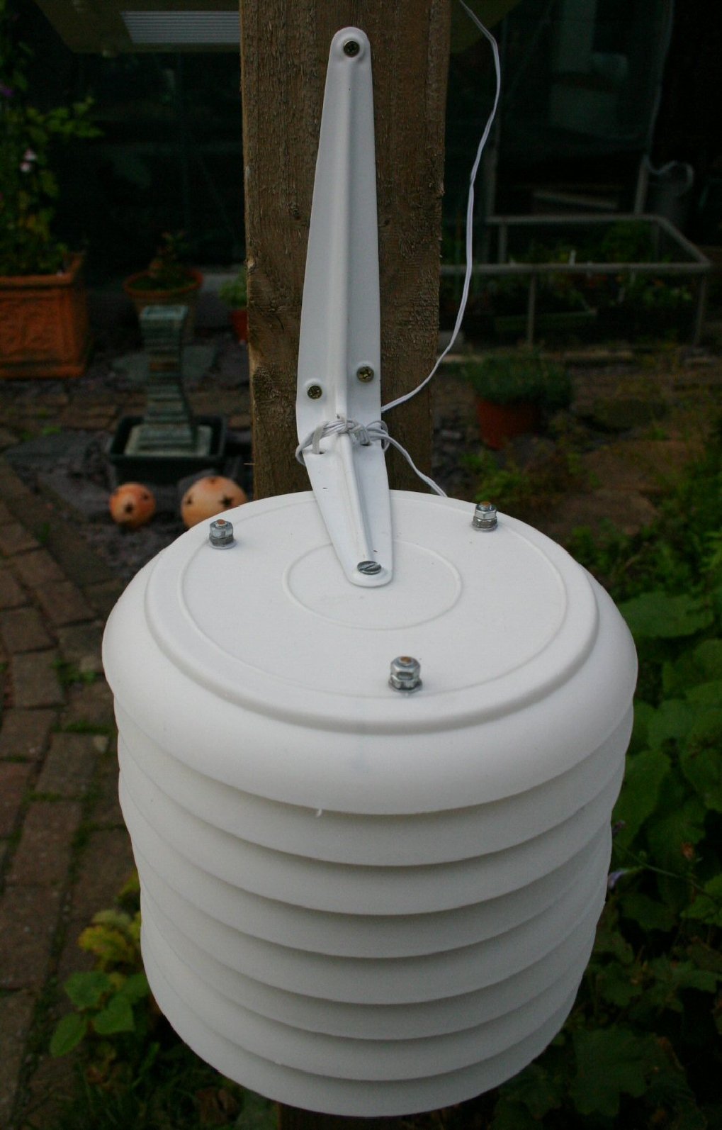 Weather screen for digital sensorThis screen can be used to house a sensor from a digital thermometer like the one in the image above. It will keep the sun, wind and rain off the sensor. The actual thermometer will need to be kept elsewhere inside. It is made from white plant pot saucers. The white colour reflects heat from the sun. See how to make it in the weather_box_sensor file. See more about digital weather on the ICT page. |
