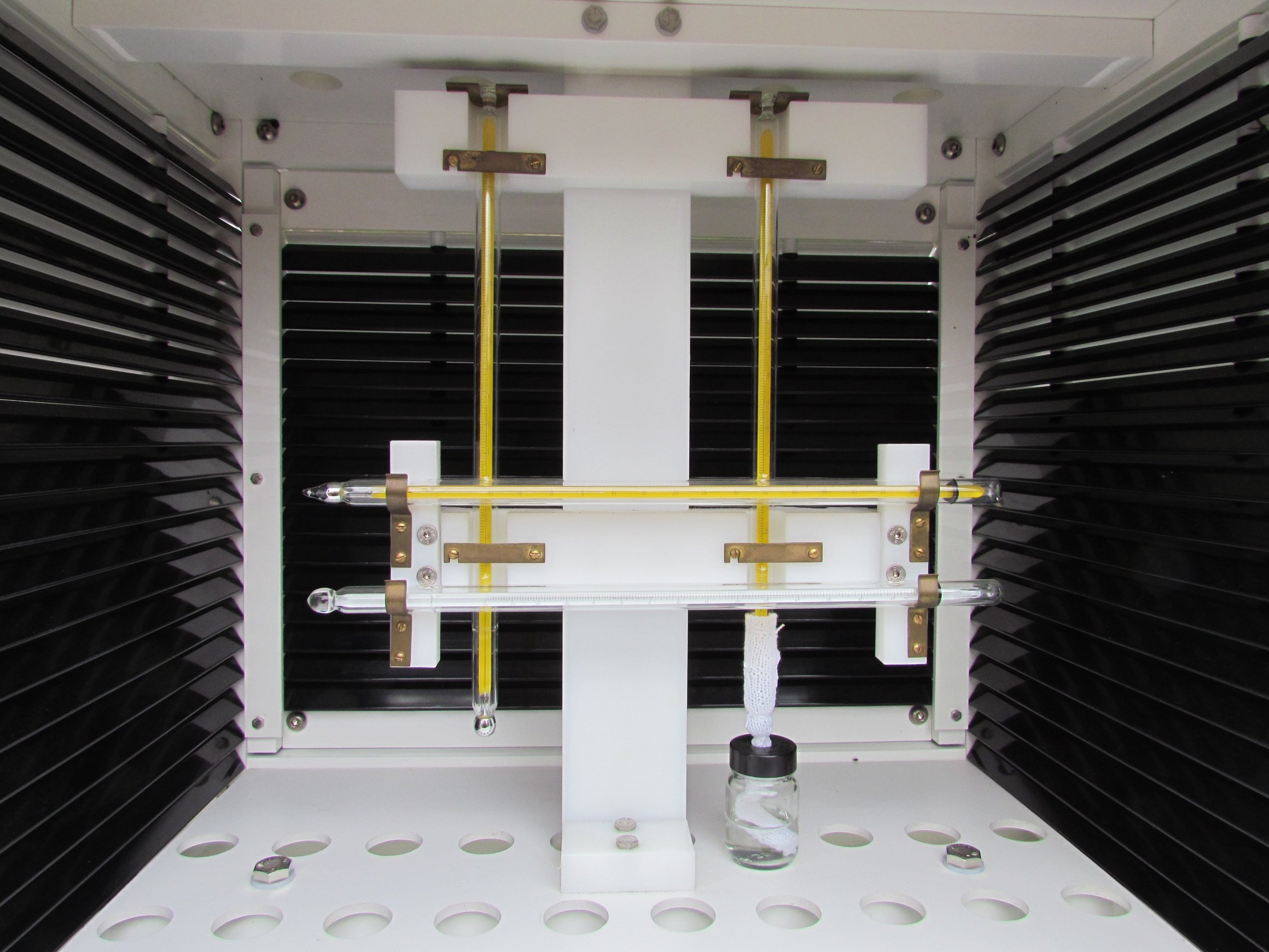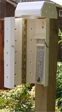 Stevenson Screen - modernSome modern Stevenson screens are made of durable materials and do not need painting. The one on the right is made of polyester powder coated aluminium and modern plastics. It does not need painting and will not go yellow. It has double louvres so that rain, sunlight and draughts cannot get inside and affect the readings. It also has a double roof and floor. |