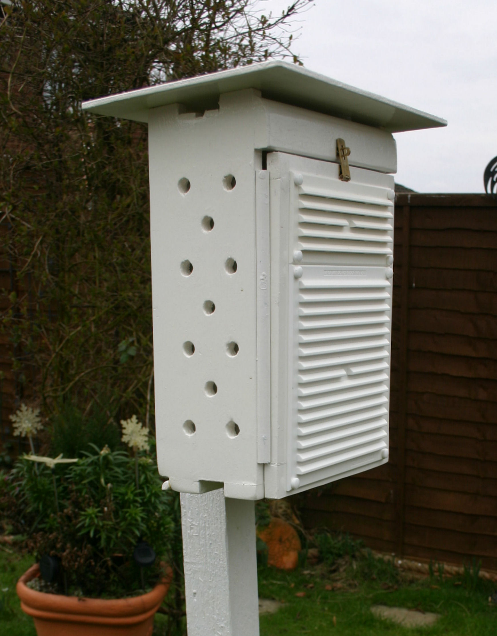 So that all weather boxes match, the outsides are white and they often have slats or louvres so that the air can circulate whilst the rain and direct wind is kept out. They need a double roof and a double floor. The weather box should be placed so that the bulbs of the thermometers (or sensors) are 1.25 meters above the ground.