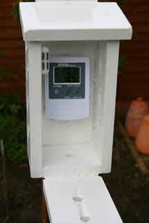 Weather box - large digitalWork is in progress on the design of a new weather box. This will be bigger than the wooden digital box featured on this page. The aim is to allow for more effective air circulation. It will be similar to the wooden deluxe weather box design, but with some useful modifications. A prototype (as yet unpainted) has now been constructed, and the next version is being constructed. See the box with and without its digital thermometer. The external measurements are approximately 27 x 19 x 37cm. |