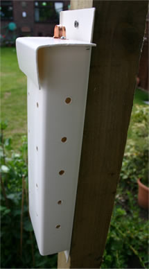 Weather box - made from plastic trunkingThis weather box has also been designed to house a maximum and minimum thermometer. You can see a video of it in use on the More About Setting Up page. It can be made cheaply and easily. To find out how to make it look at the weather_box_trunking file. Remember that there is a standard height for you thermometers. Check for more details about where and how you should position your weather box on the Setting Up page. |